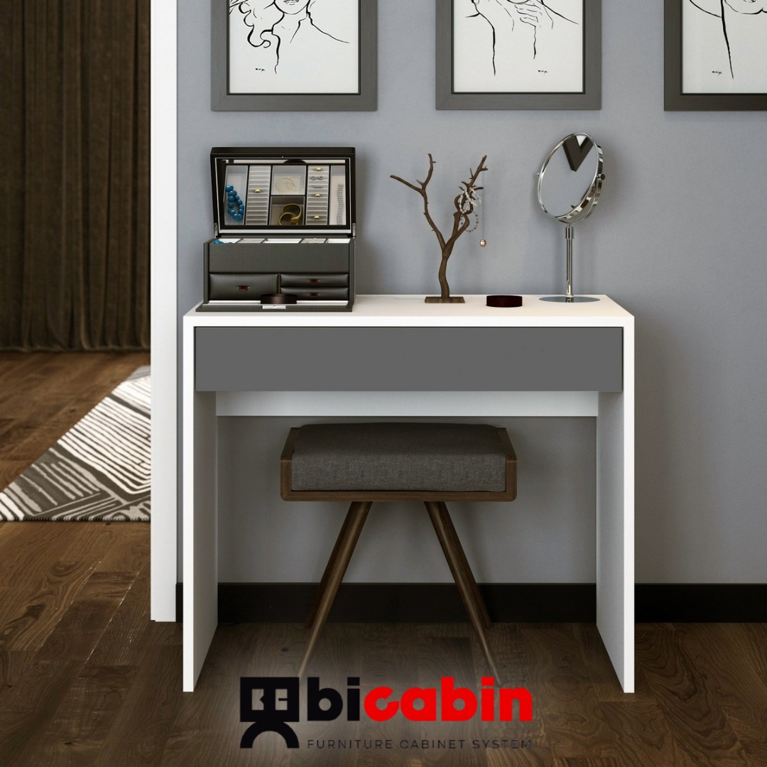 - Modern tasarımıyla her odaya şıklık katan Arya Novella bölmeli organizer çekmeceli makyaj masası, Antrasit/Beyaz rengiyle ferah bir görünüm sunar.