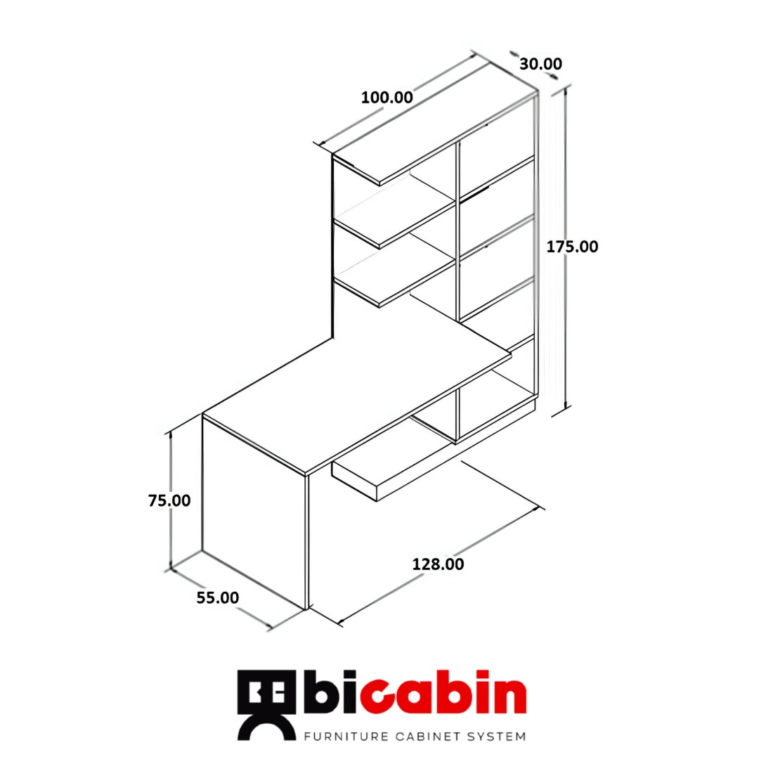 Masa Genişliği:128 cm · Masa Derinliği: 55 cm · Dolap Genişliği: 50 cm · Dolap Derinliği: 30 cm · Raf Genişliği: 30 cm · Raf Derinliği: 30 cm