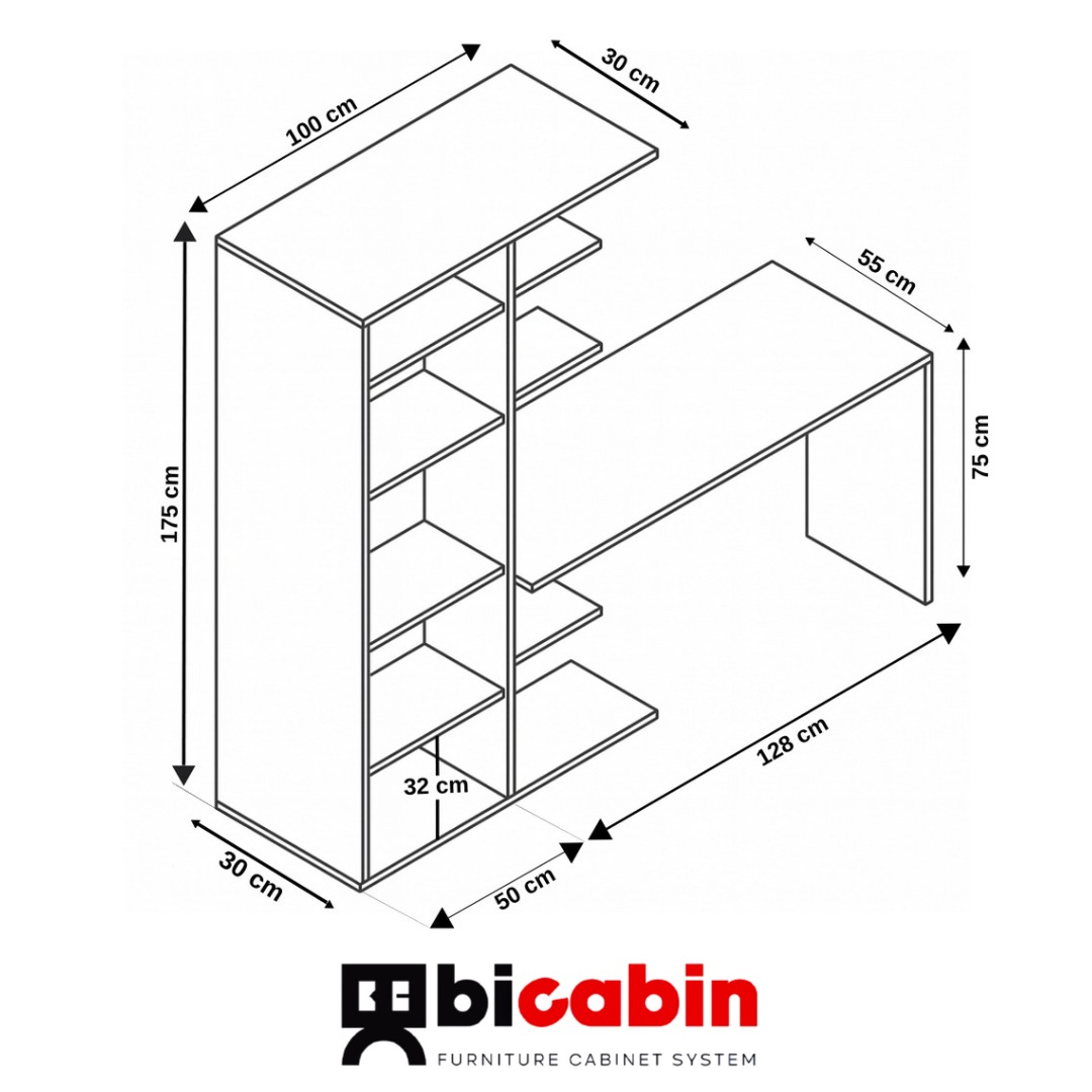 Masa Genişliği:128 cm · Masa Derinliği: 55 cm · Dolap Genişliği: 50 cm · Dolap Derinliği: 30 cm · Raf Genişliği: 30 cm · Raf Derinliği: 30 cm